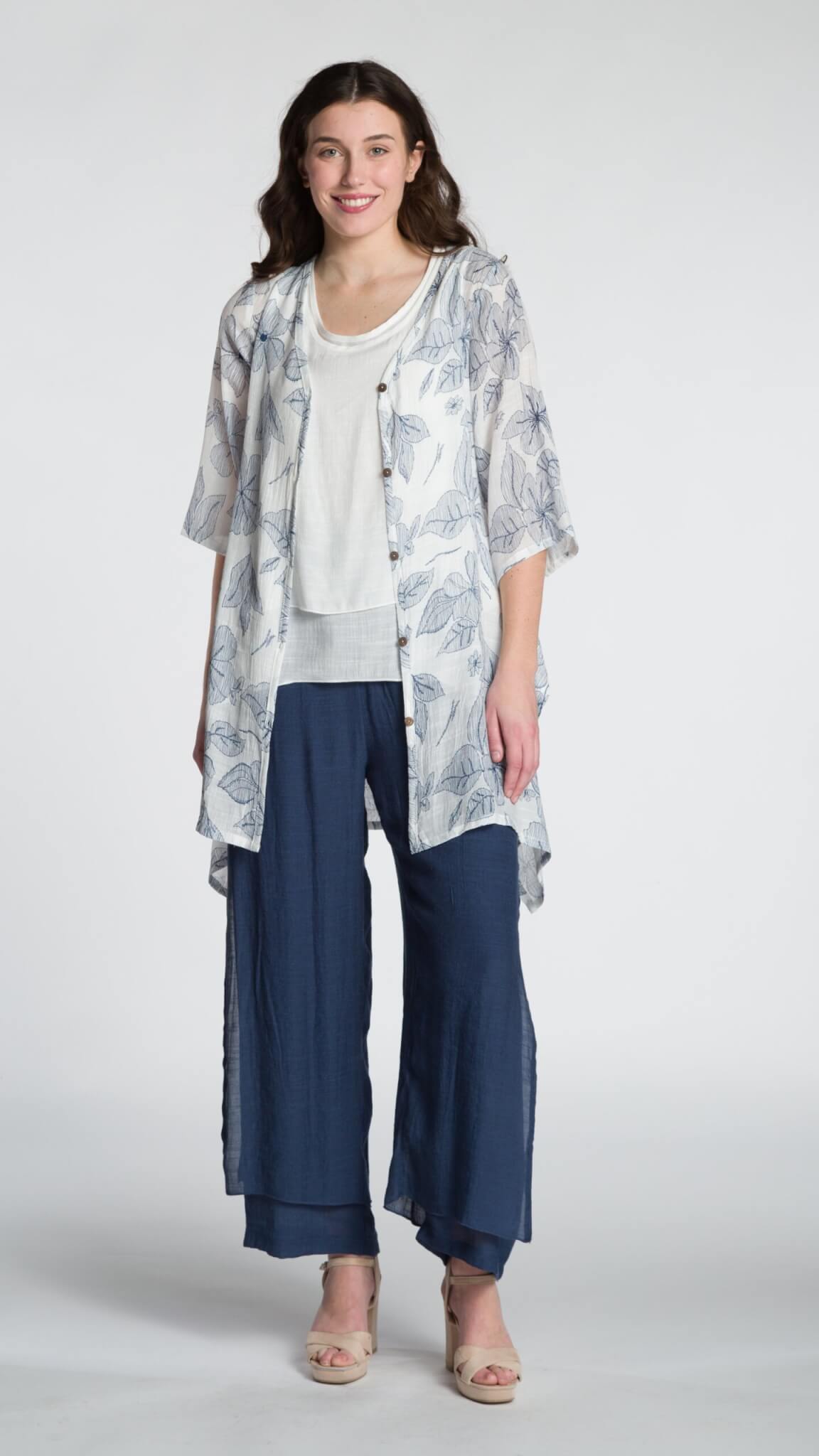 Printed 3/4 Sleeve V-Neck Button Front Cardigan with Asymmetrical Hemline